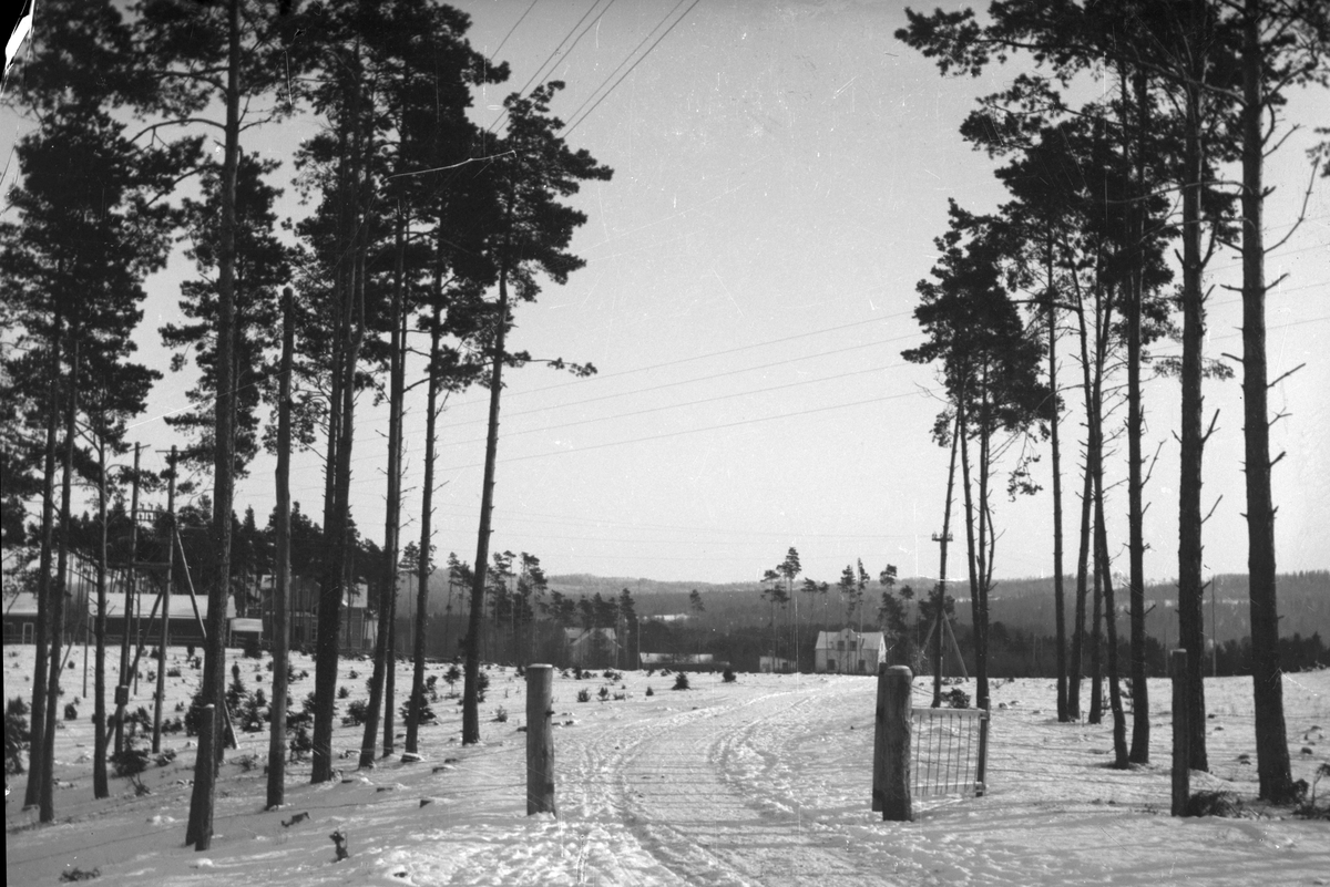I skogsbrynet är en grind öppen ut mot ett snöigt fält. I bakgrunden syns några hus.