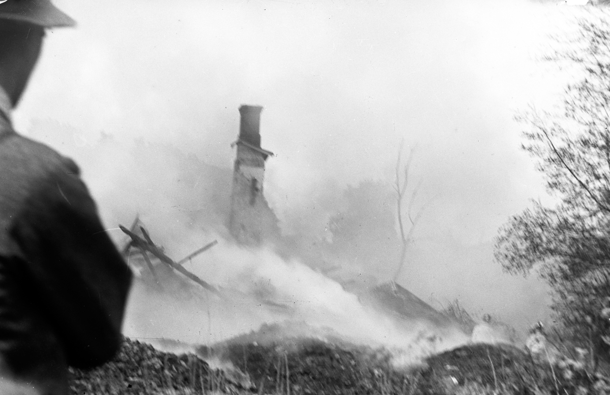 Murstocken står kvar i röken från ett nerbrunnet hus. En man betraktar förödelsen.