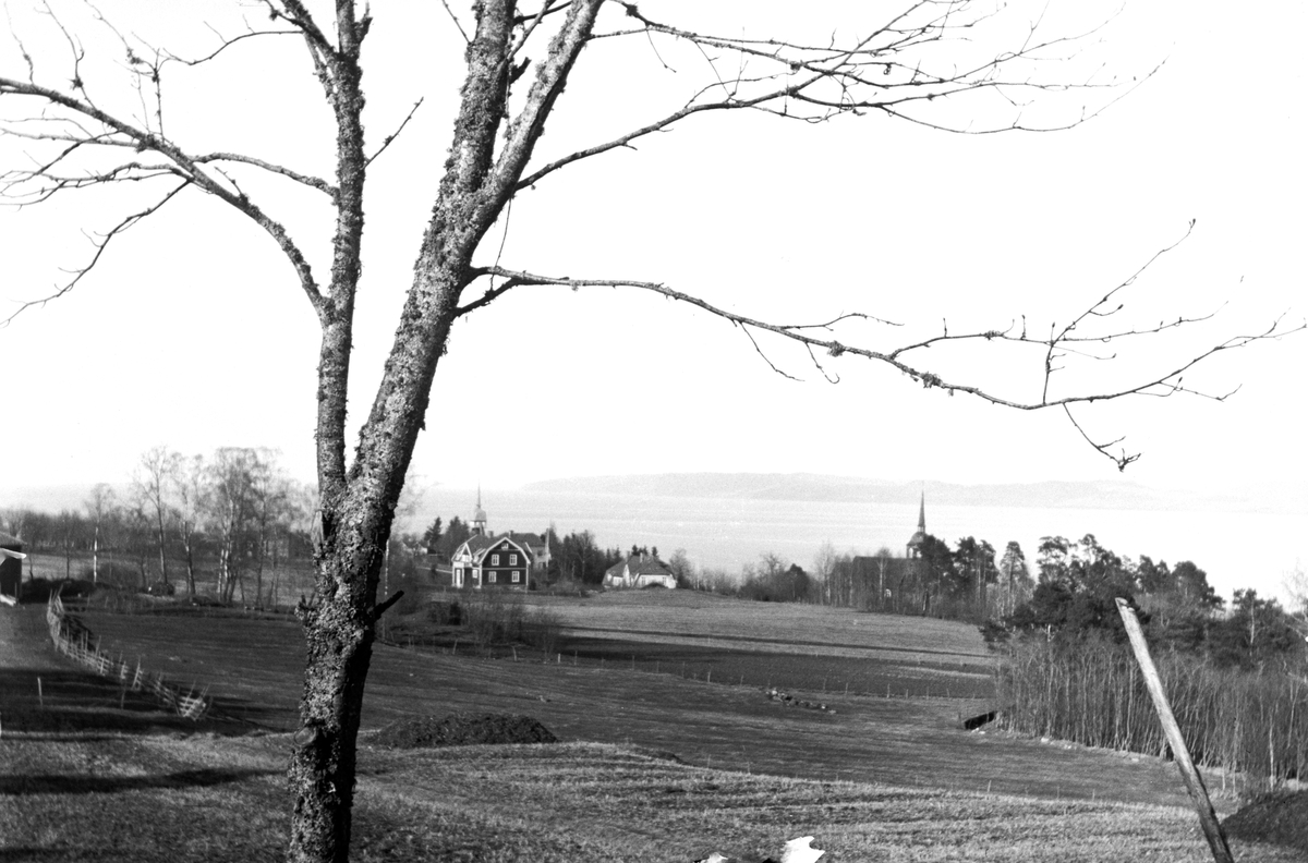 Fält, gård och Bäckaby kyrka med utsikt över Jönköping och Vättern.