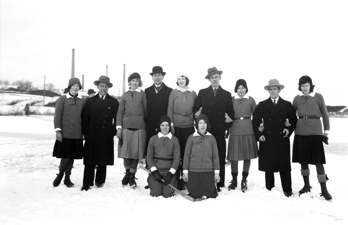 Kvinnor med skridskor, en med bandyklubba, står tillsammans med några män på Munksjön i Jönköping.