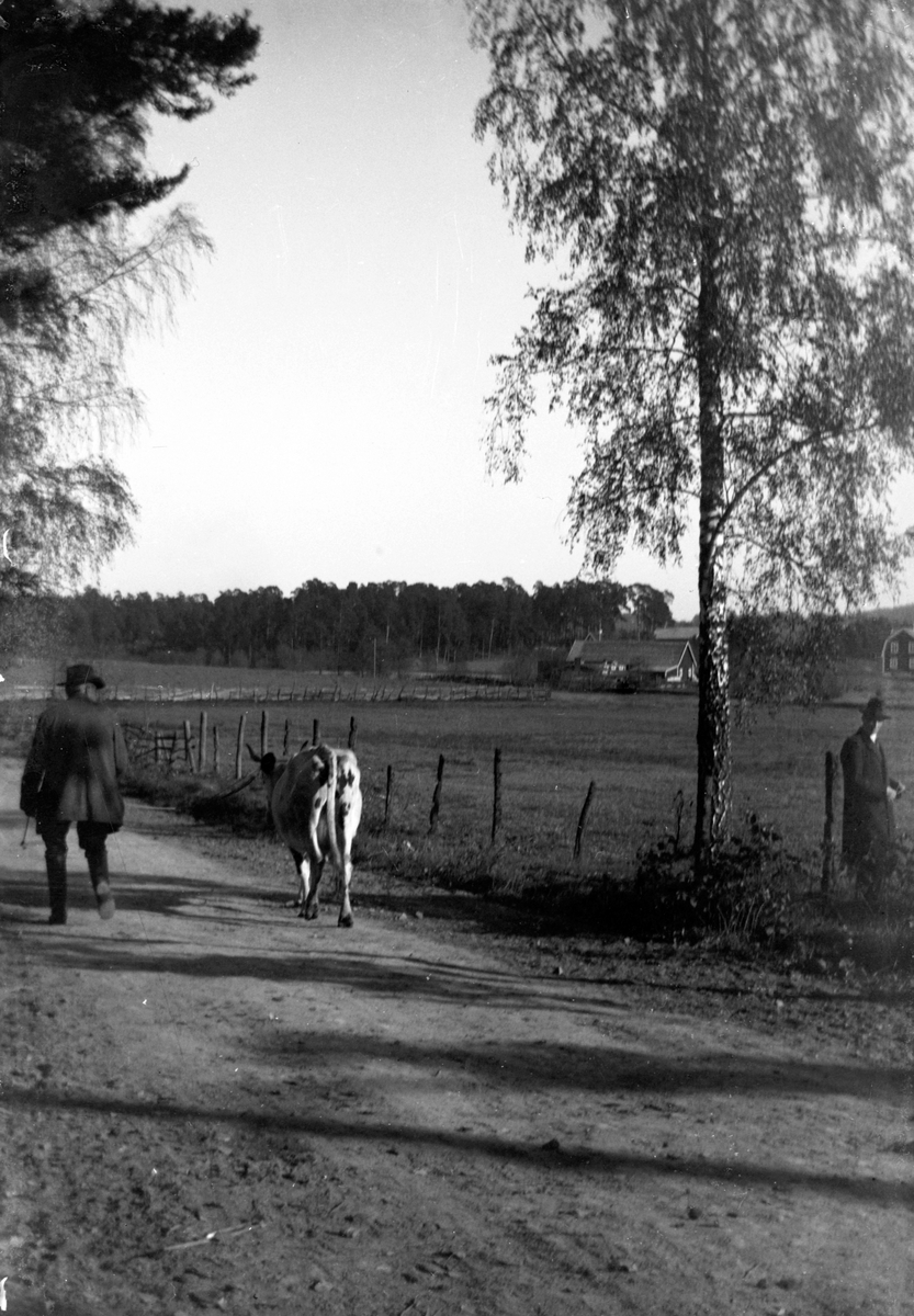 En man leder en ko på vägen mot gården. Vid stängslet står en man i hatt och lång rock och tittar.