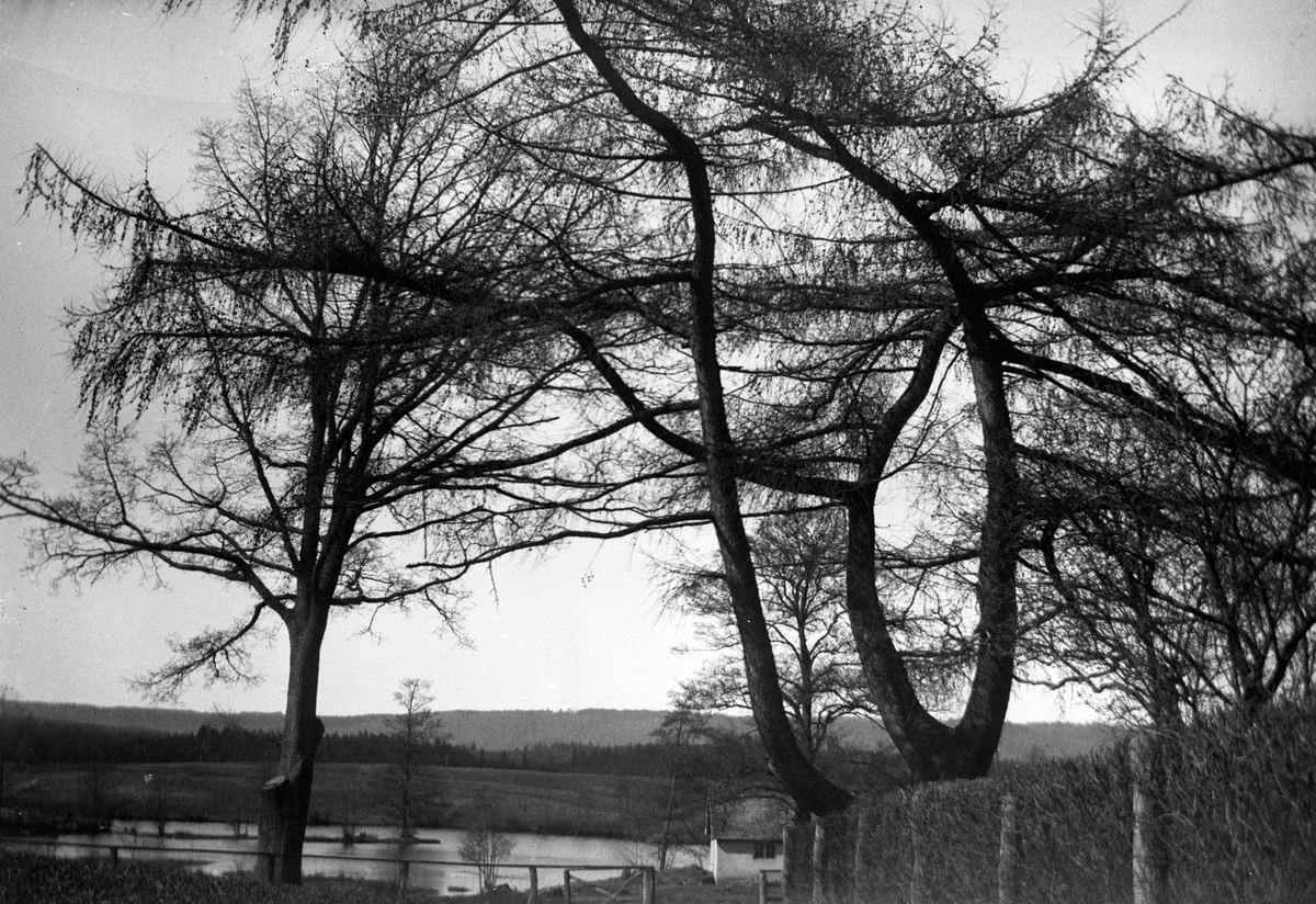 Ett landskap med en vattenfylld sänka och stora träd i förgrunden.
