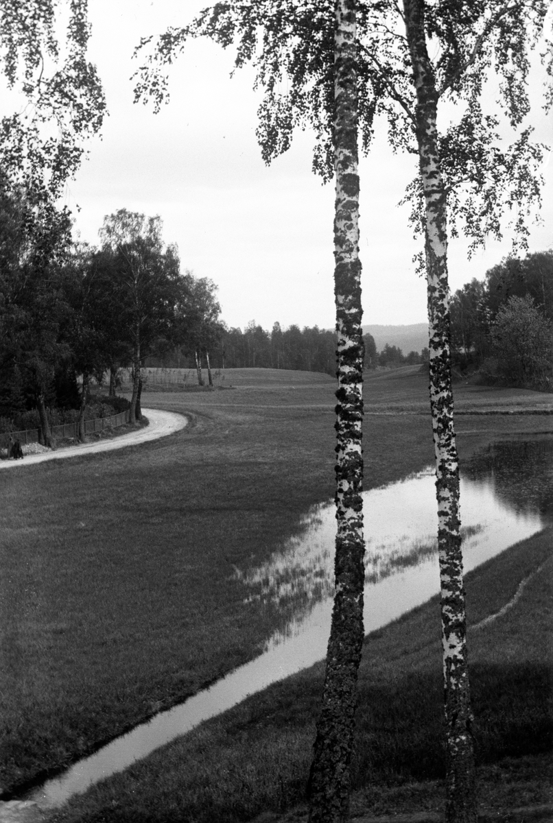 Ett landskap med en vattenfylld sänka och björkar i förgrunden.