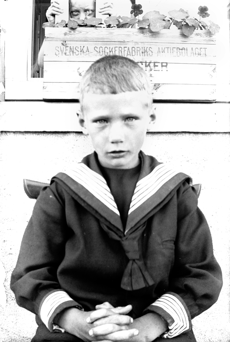 En sjömansklädd pojke sitter på en stol framför ett hus. I bakgrunden kikar ett barn fram mellan spjälorna bakom en sockerlåda som används som blomlåda. På den står det "Svenska sockerfabriks aktiebolaget Socker"