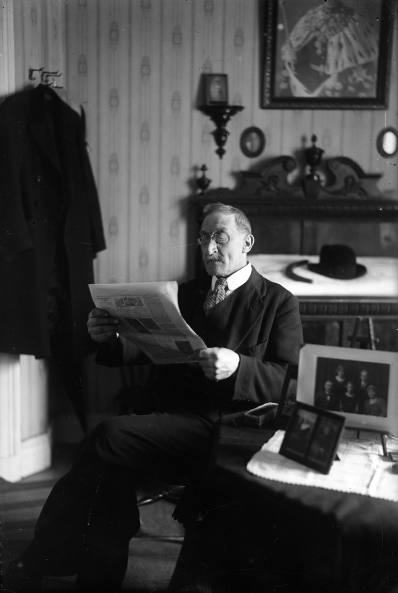 En man sitter och läser tidningen vid ett litet bord med vit duk och fotografier på. Bakom honom står en säng med utsirad sänggavel. På sängen ligger en hatt och käpp.