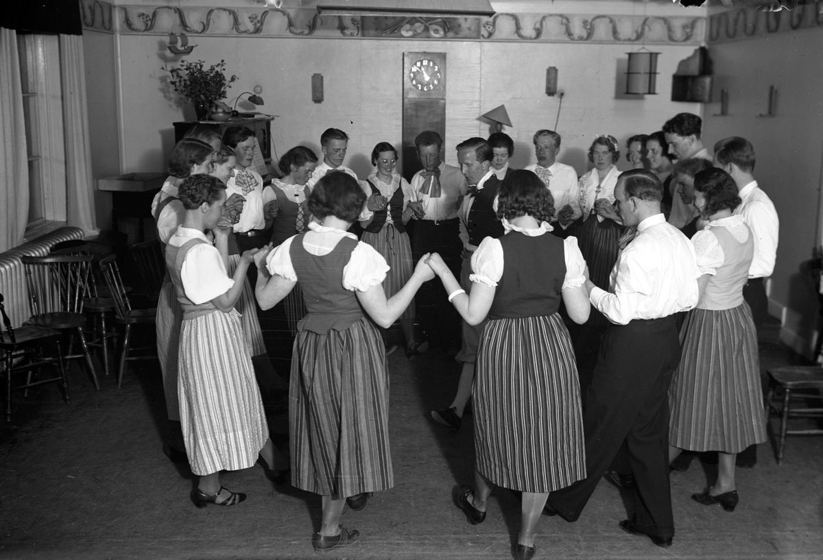 I mitten: Charlie Björnstad, ledare. Framför klockan i mitten, åt höger: Folke Karlsson (1), Svea Björk (2), Gösta Johansson (3), Märta Appelqvist - Hedman (4), Ingrid Wendel (5), Britta Andersson gift. Ahnström (6), Hubert Johansson (7), Gulli Andersson gift Eriksson (8), Olle Eriksson (9), Lalla Andersson (10), Bertil Jägmar (11), Inga Johansson gift Claesson (12), Margareta Axberg gift Enander (13), Selma Malmqvist (14), Inez Lager (15), Ragnar Järebrant (16), Tora Larsson (17), Lennart Enander (18), Maria Andersson gift Hagvall (19), Karl Gustav Björk (20), Doris Johansson (21). Utställning 1989.