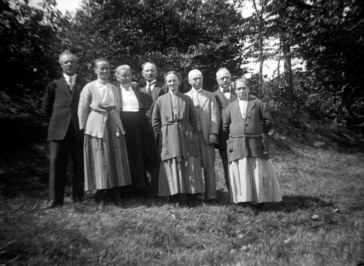 Titel: Män och kvinnor står i en skogsbacke. Längst till höger fotograf Gustav Anderssons föräldrar Ottilia och Johan August Andersson.