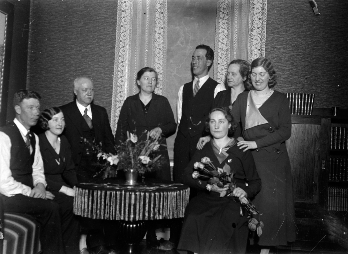 Människor är samlade runt ett bord. En kvinna har blommor i handen och på bordet står en vas med blommor.