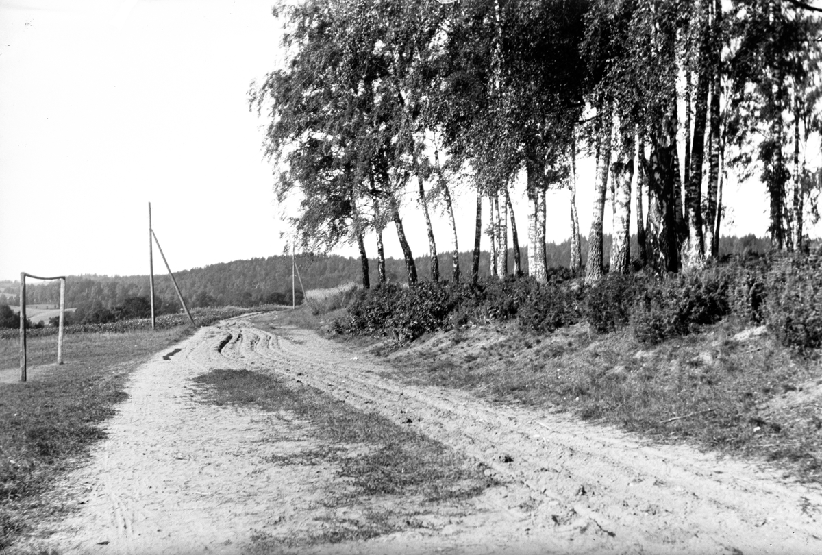 En väg med djupa hjulspår går utmed fälten. Till höger en träddunge och till vänster ett fotbollsmål.