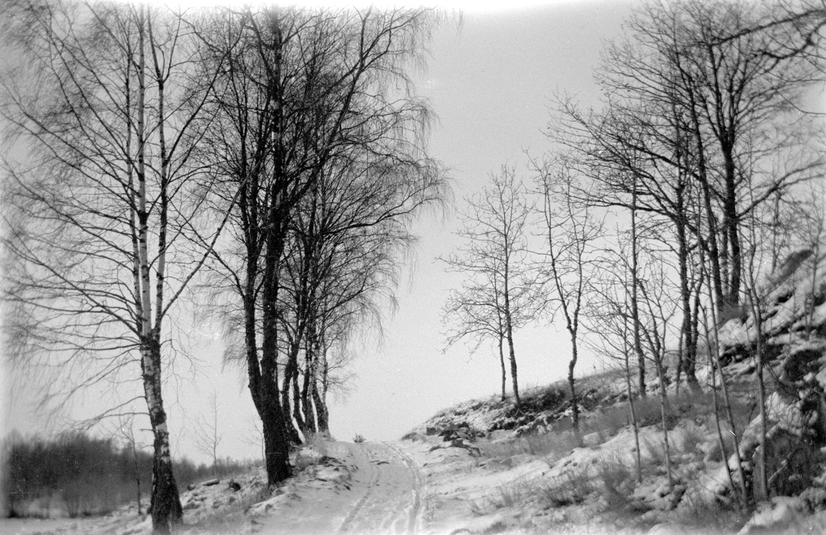 En snöig skogsväg utmed en trädbevuxen sluttning.