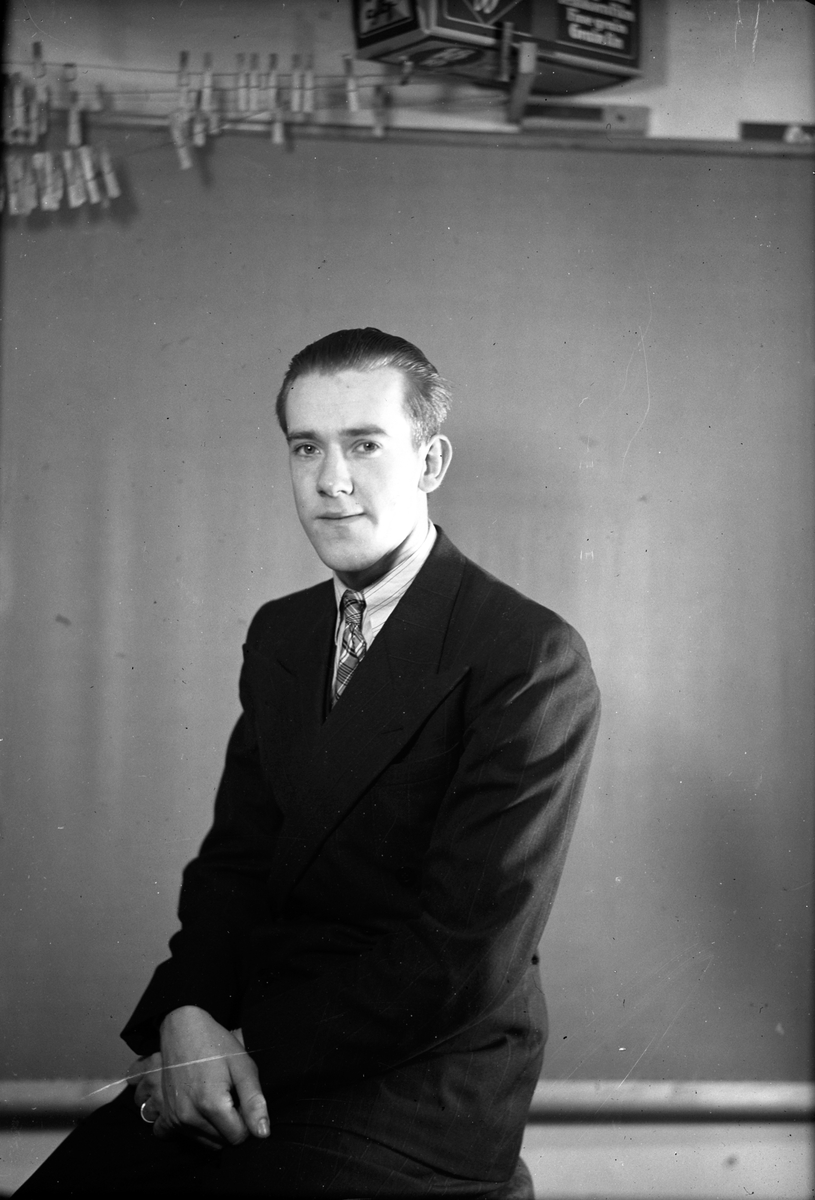 Porträtt av en man. Ovanför honom hänger klädnypor av trä på trådar.