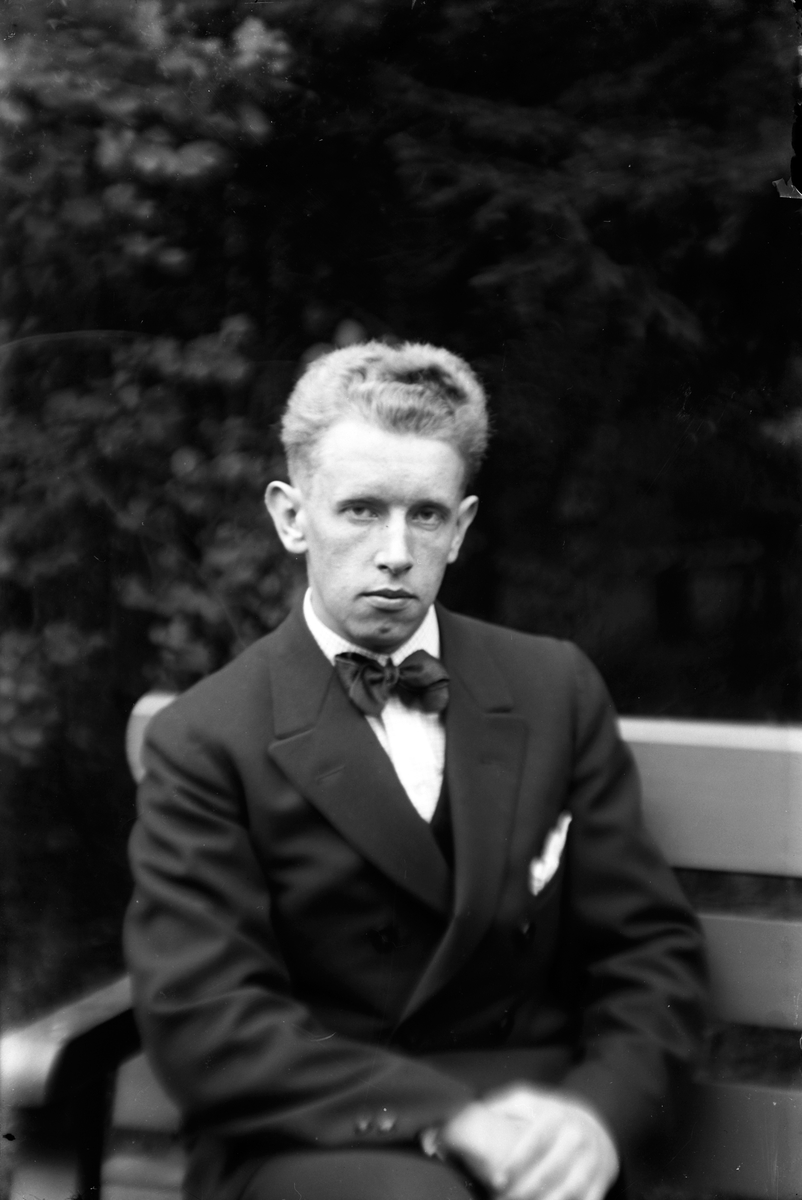 Porträtt av en ung man klädd i kostym, vit skjorta och fluga, på en parkbänk.