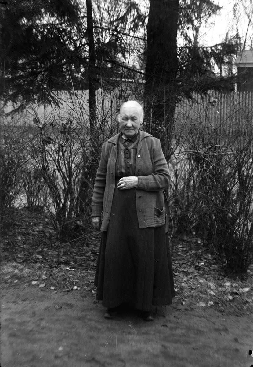 Porträtt av en äldre dam klädd i lång kjol och kofta.