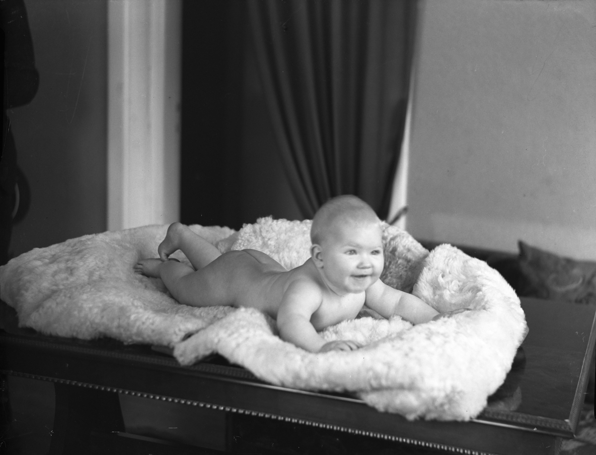 Porträtt av ett litet barn som ligger på en skinnfäll på ett bord.