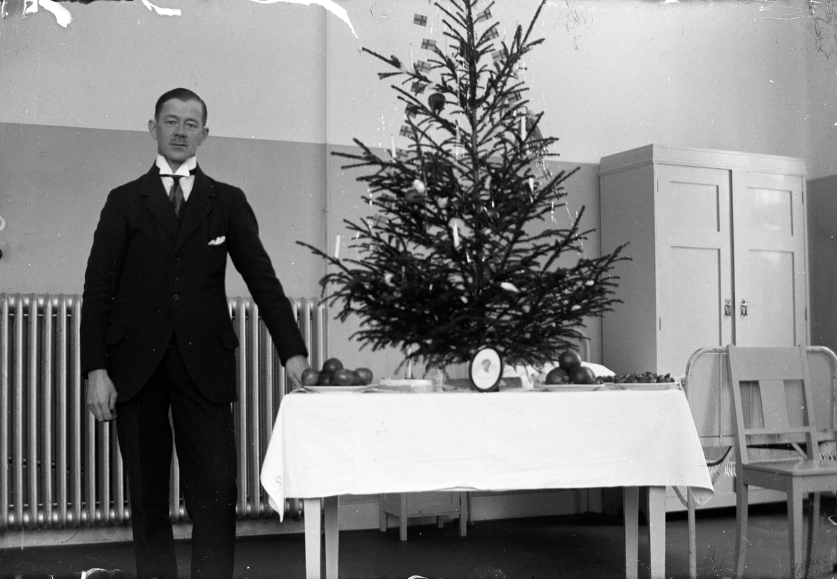 En man står vid ett bord med en julgran på, i bakgrunden element och skåp. Lungkliniken i Eksjö.