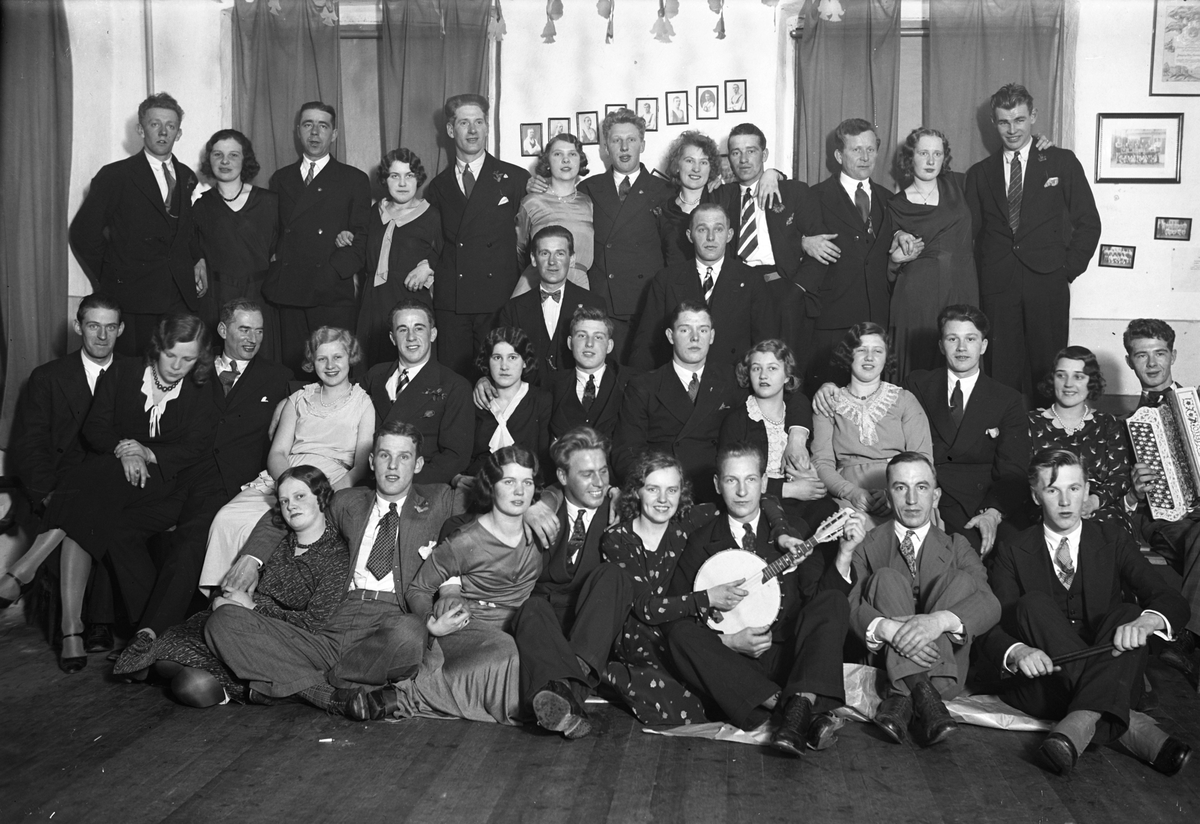 En gruppbild på unga män och kvinnor i en samlingslokal.