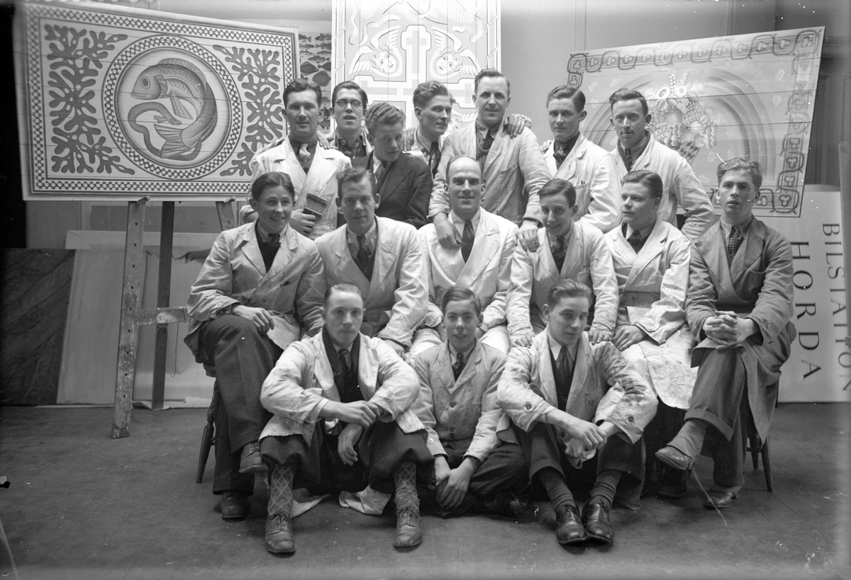 En grupp yrkesmän med sakrala motiv på tavlor i bakgrunden.