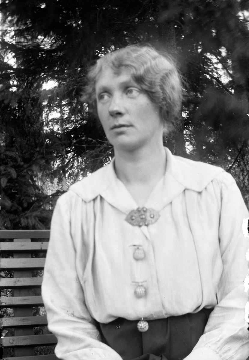 En kvinna sitter på en bänk med skog och vatten i bakgrunden.