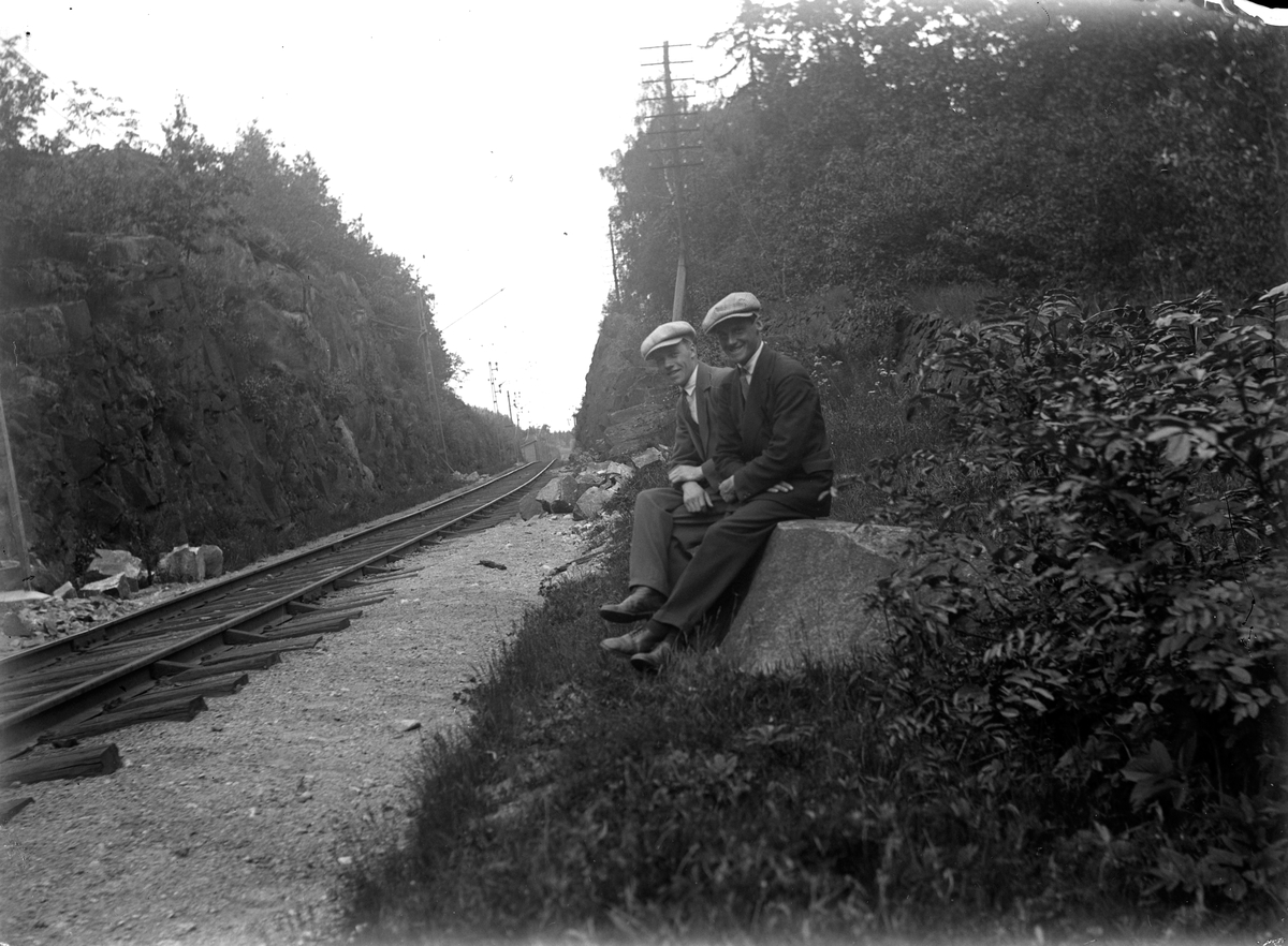 Två män sitter vid ett järnvägsspår som går mellan två branta bergväggar.