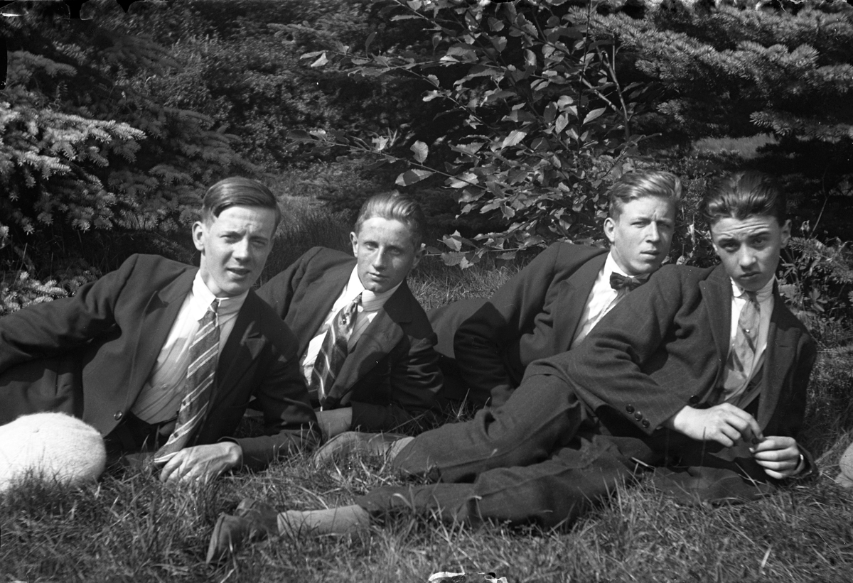Fyra unga män ligger i gräset framför några träd.