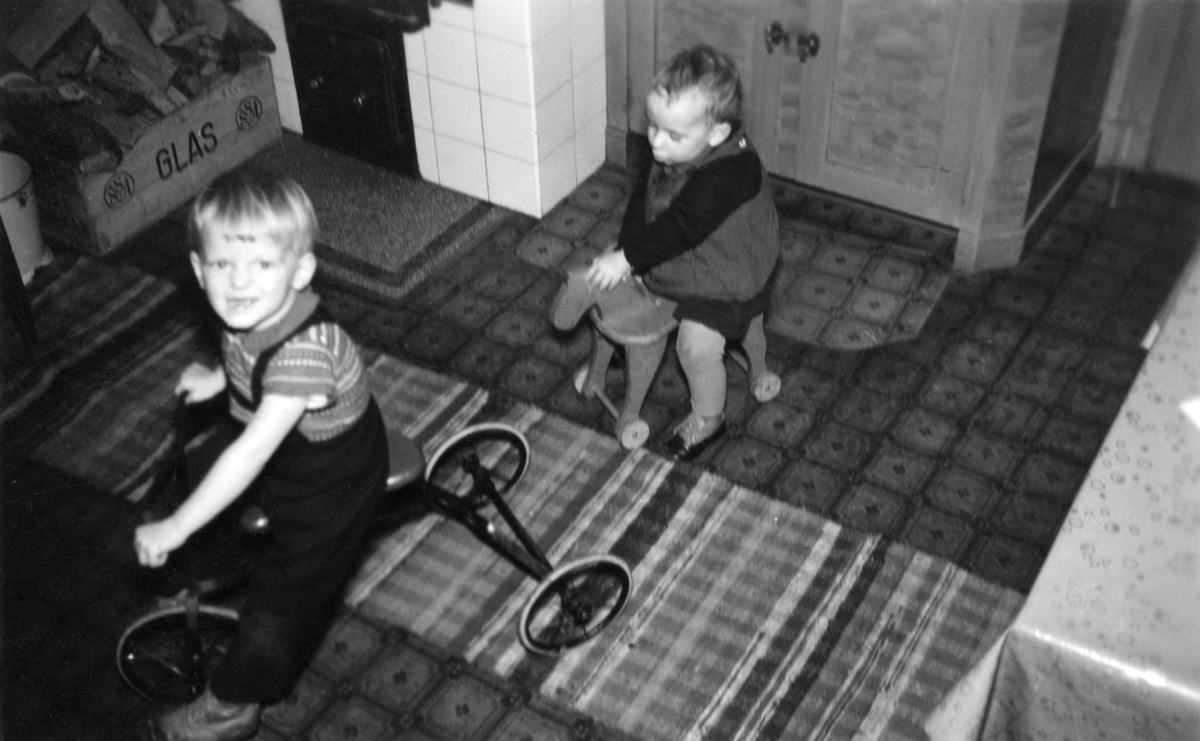 Två barn leker med en trehjulig cykel och en trähäst på hjul.