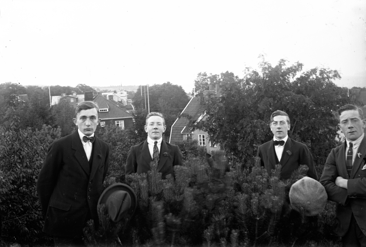 Fyra män står bakom en tallbuske, två av dem har hängt sin hatt och keps på grenarna. I bakgrunden syns hus och träd.