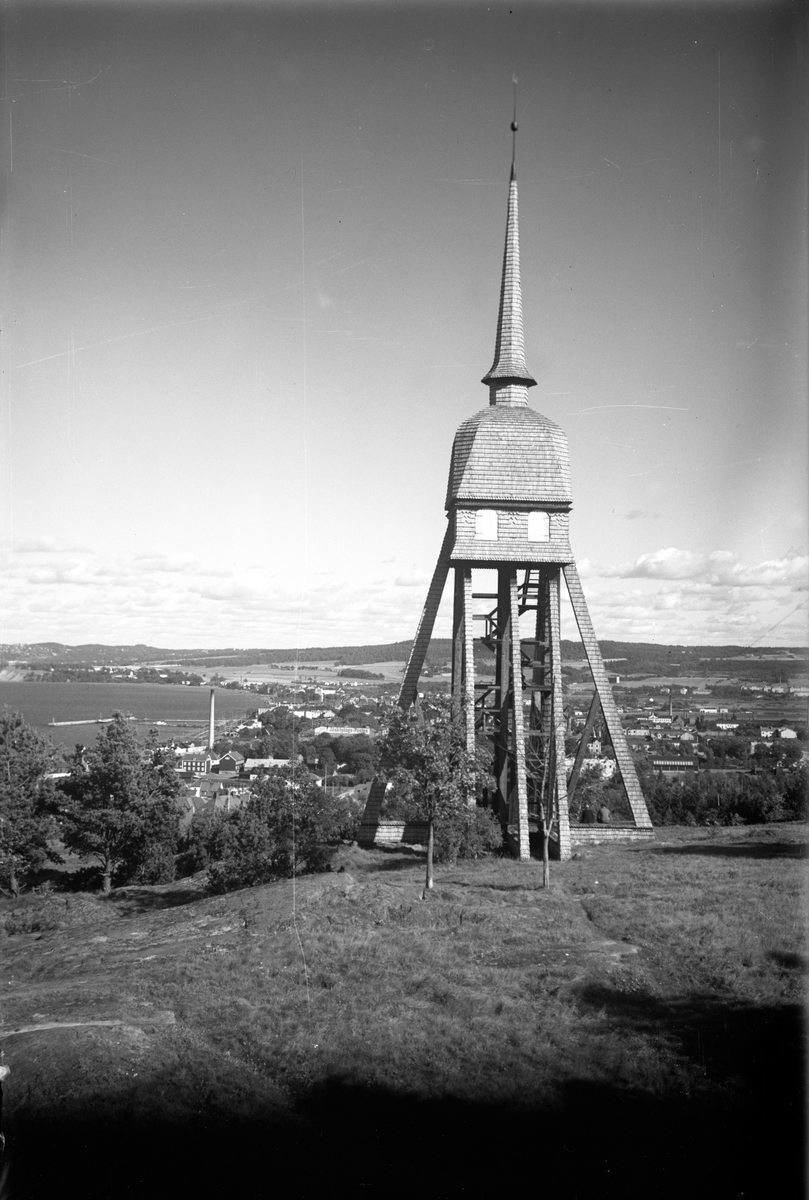 Solberga klockstapel i Jönköpings Stadspark med utsikt över Jönköping.