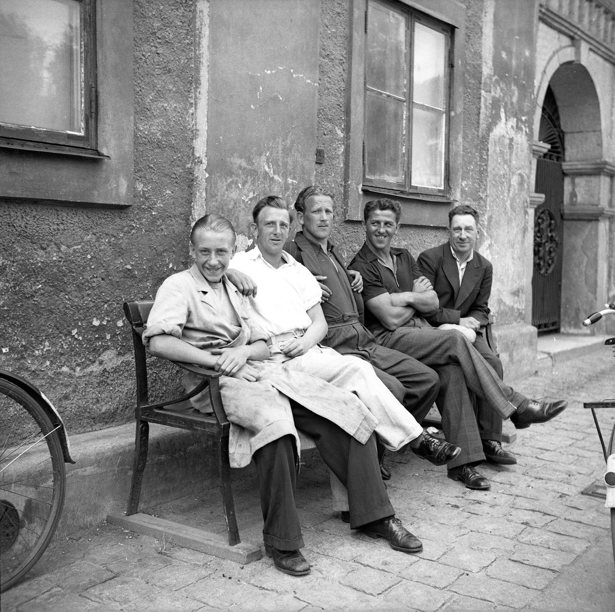 Några JFF:are sitter på en soffa vid Rådhuset i Jönköping. Bengt Johansson, Stig "Månen" Johansson, George Thörnqvist, Nils Bäckman och Karl Palm.