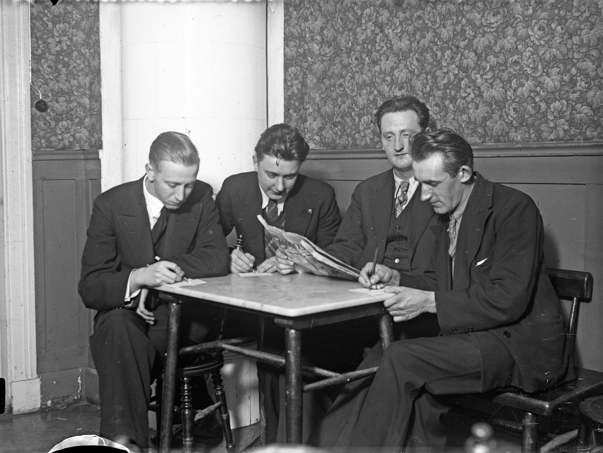 I studierummet "Vinterstugan" på Pilgatan 14 i kvarteret Jupiter, Jönköping, sitter Bengt Dimgren, Valter Andersson, Erik Svensson "Skojsen" och Jens.