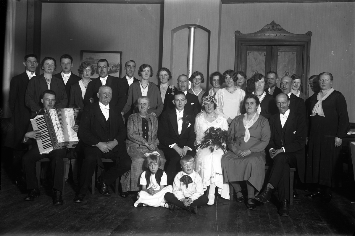 Ett brudpar med släkt och vänner är samlade för fotografering av Gustav Andersson, Jönköping. En man till vänster sitter med ett dragspel i knät.