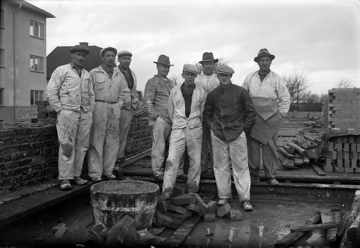 Murare vid nybyggnad i kvarteret Fogden, Jönköping. Mannen i mörk jacka är Åke Sandahl.