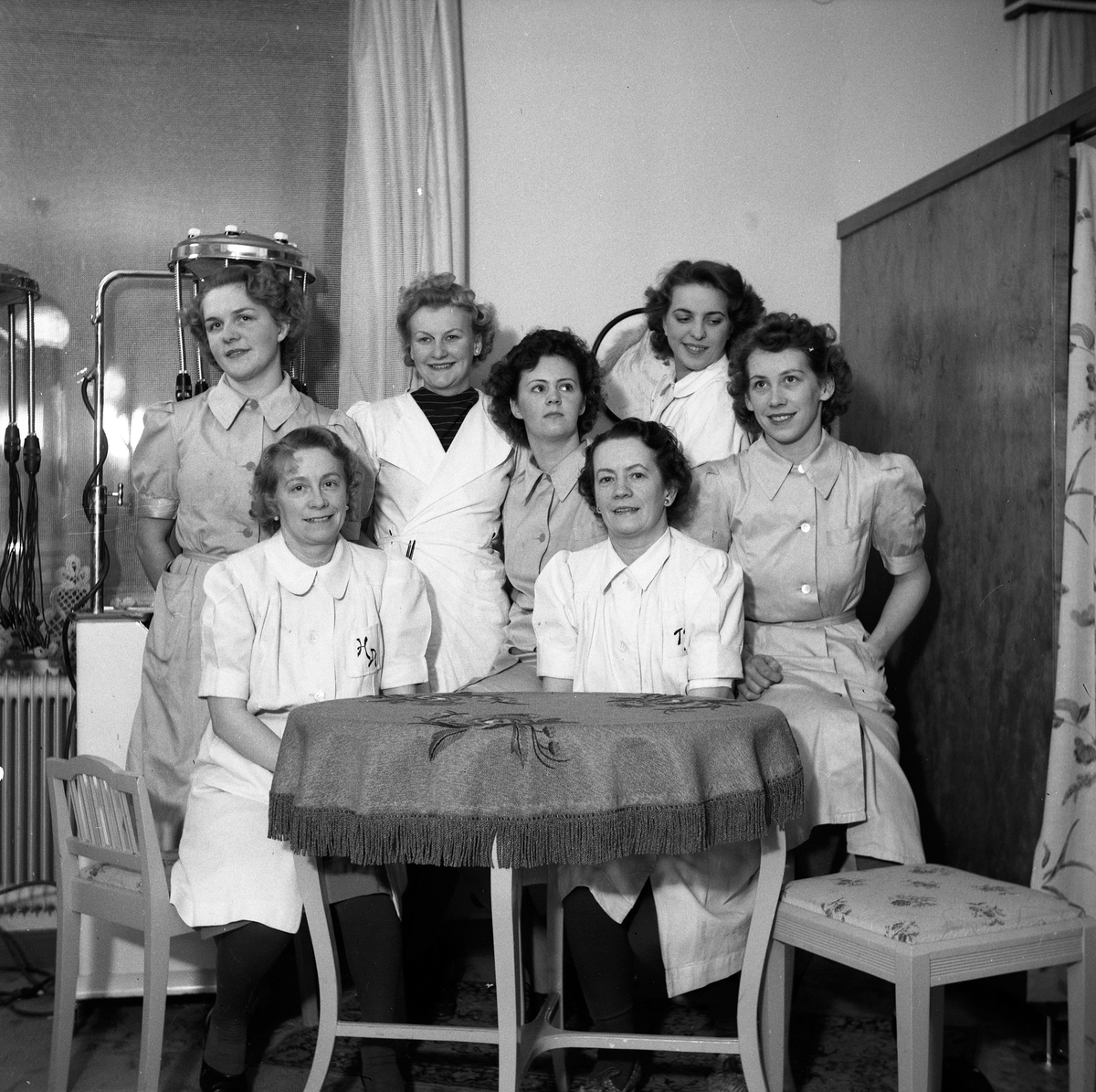 Sju kvinnor på Hennys damfrisering i Västerhuset i Jönköping. Sittande från vänster: Henny Druell och hennes syster Tillan Johansson.