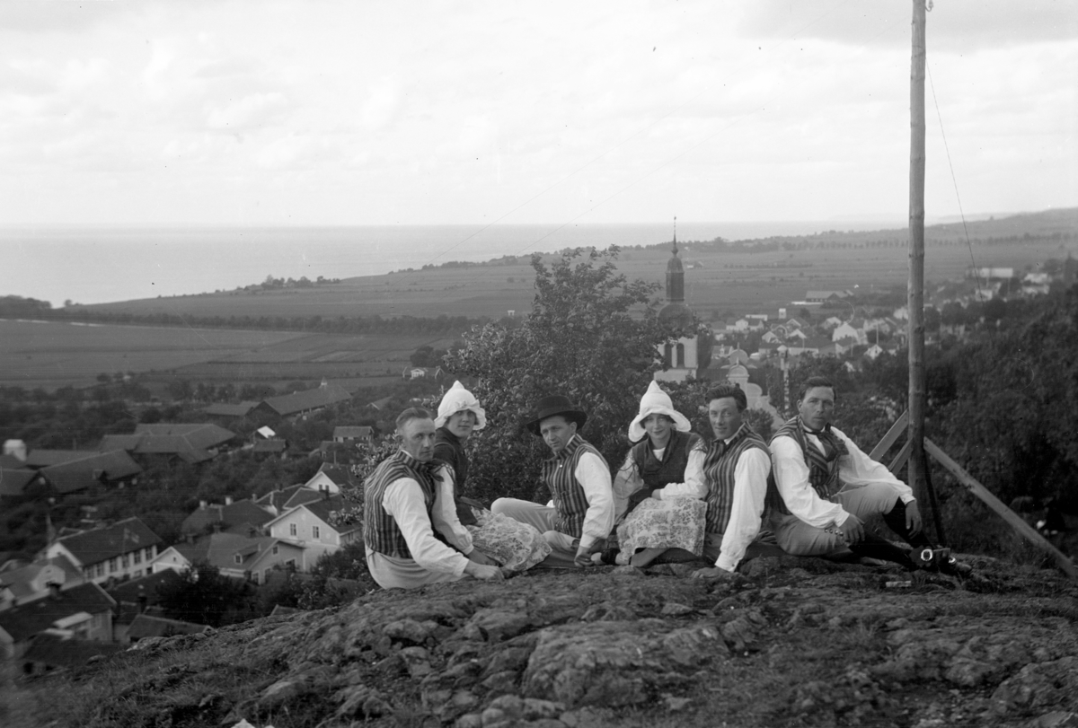 Några män och kvinnor klädda i folkdräkt sitter på Grännaberget med utsikt över Gränna och Vättern.