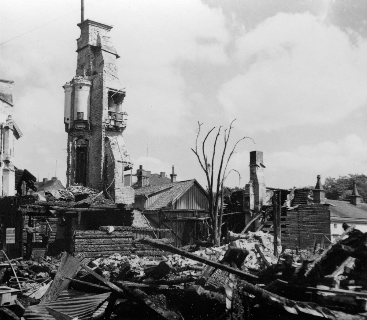 Ett hus har rivits och murstocken med kakelugnar står kvar.