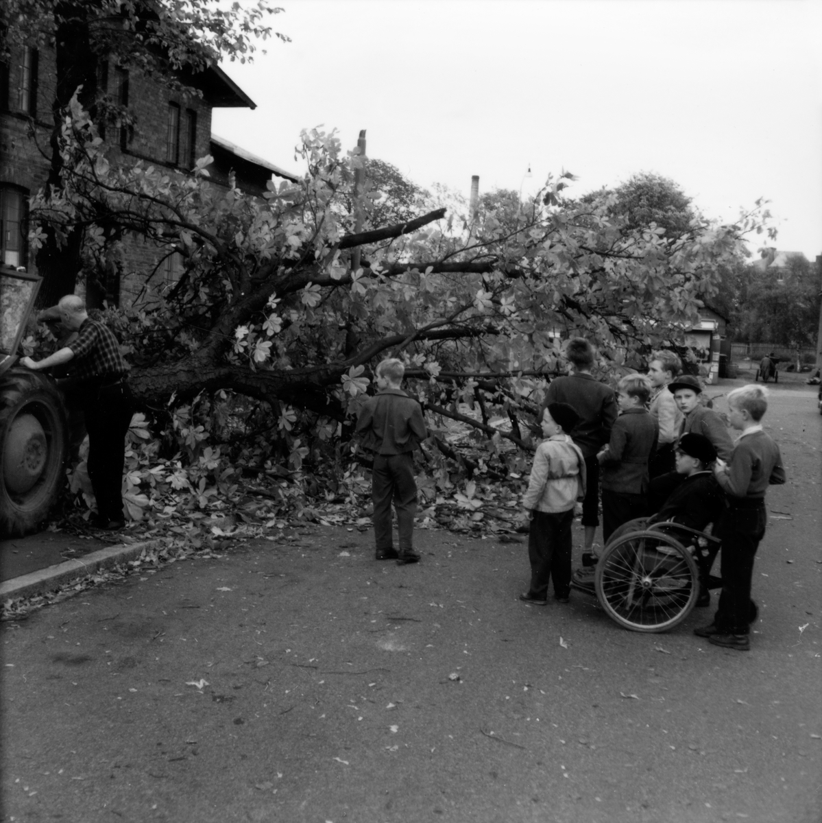 Trädfällning. En man med traktor forslar bort en stor gren och några barn är åskådare, bland annat Bo Roman i rullstol. Pojken med keps är Rolf Hjertqvist.
