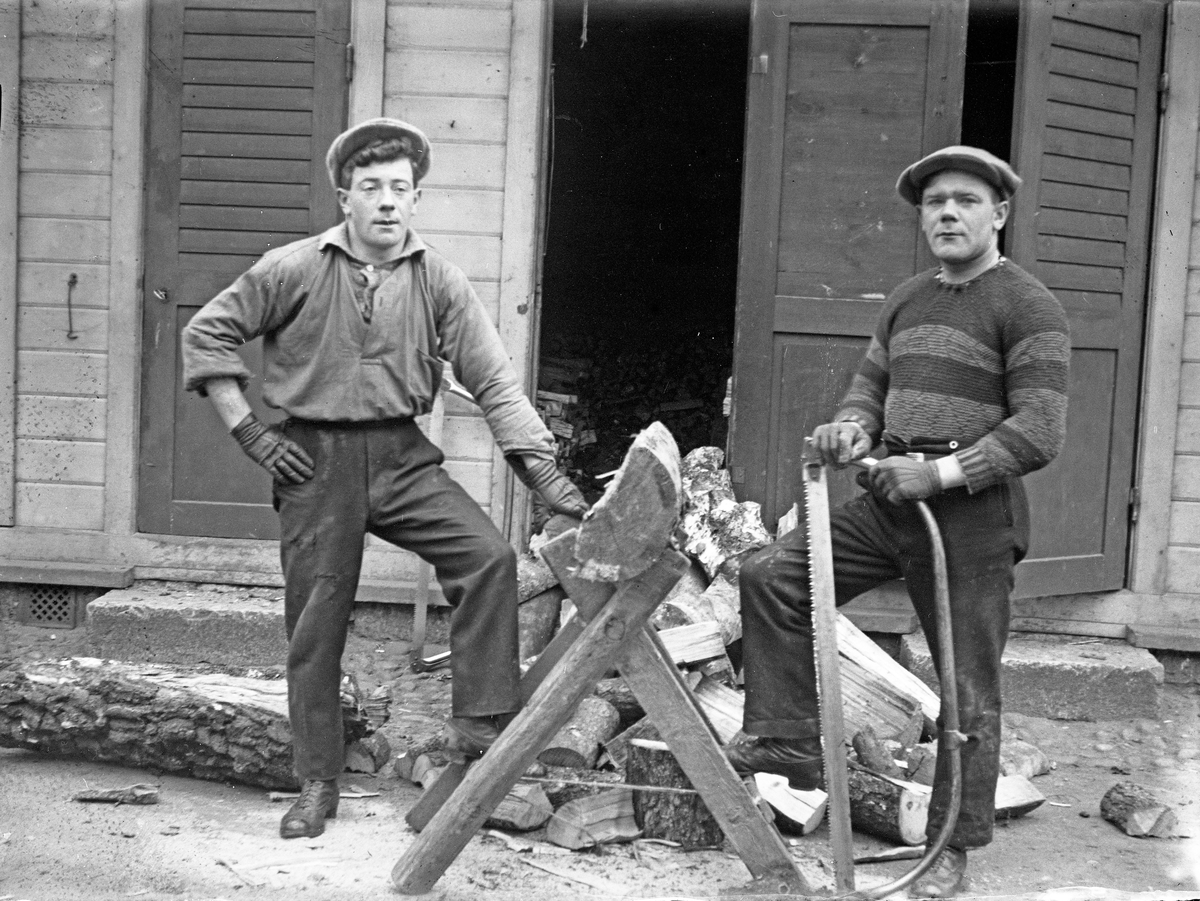 Vedsågning vid "Bostäderna" i kvarteret Jägmästaren i Jönköping. Männen är Georg (Gidde) Nilsson (1) som flyttade till Stockholm och Gustav Nilsson (2) som emigrerade till Amerika.