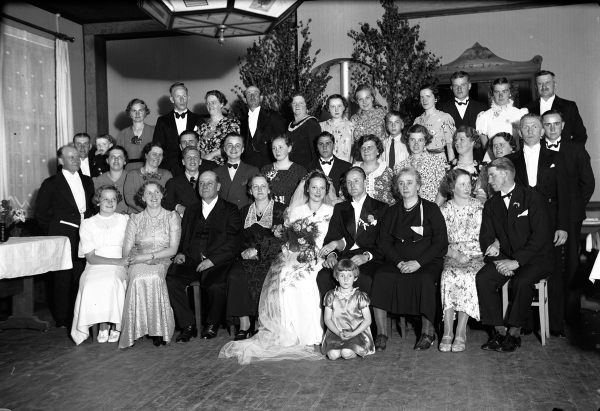 Ett brudpar med släkt och vänner är samlade för fotografering av Gustav Andersson, Jönköping. Bruden är klädd i lång klänning och slöja, brudbuketten består av nejlikor och grönt. Burdgummen är klädd i frack med en nejlika fäst på rockslaget.