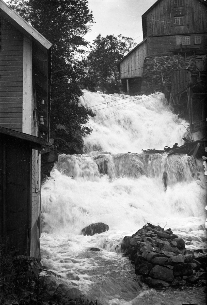 Wickboms kvarn till höger och den provisoriska kraftstationen som byggdes 1915 till vänster vid fallen i Gränna.