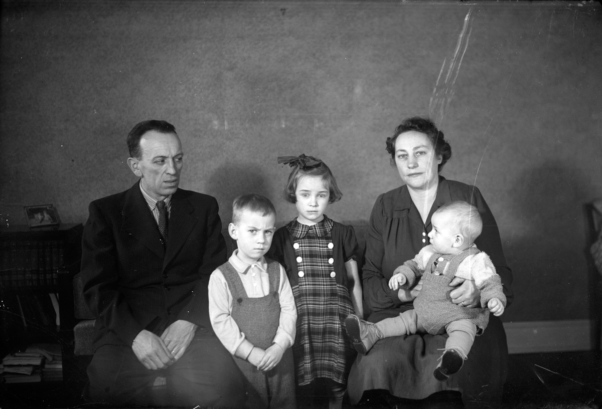 En man och en kvinna sitter på varsin stol, mellan dem står en pojke och en flicka och kvinnan har ett spädbarn i knät.