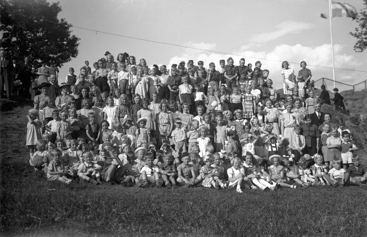 Ett stort antal barn är uppställda för fotografering, vid sidan står några vuxna.