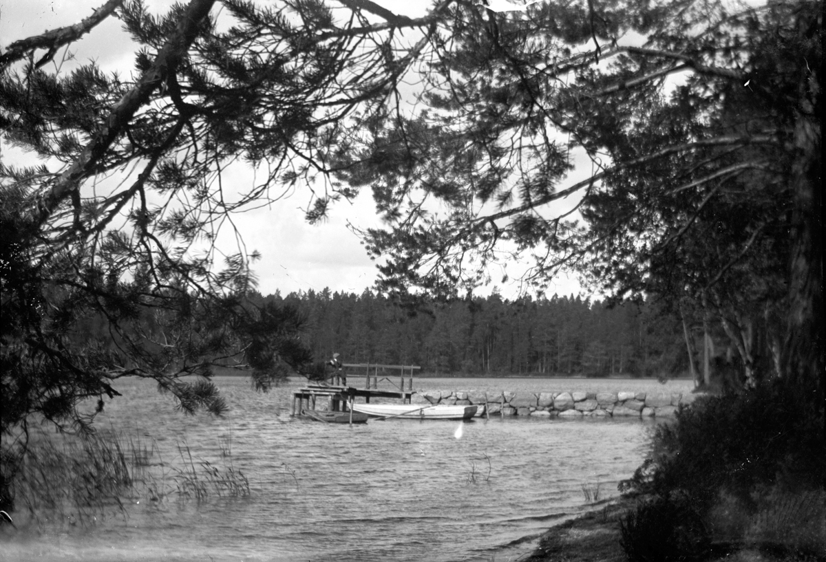 På bryggan i sjön sitter en man på soffan och en stor och en liten eka ligger förtöjda vid kanten.