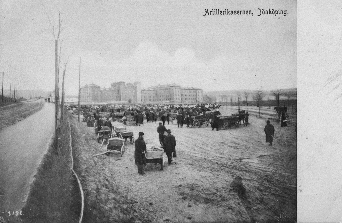 Brefkort med motiv från en marknad på Oxbacken vid Artillerikasernen, A6 i Jönköping.