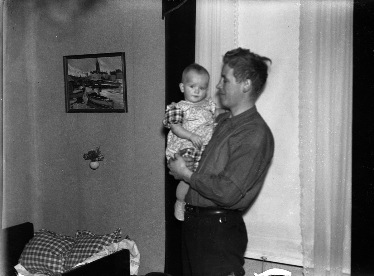 En man med ett litet barn på armen står framför ett fönster med nerdragen rullgardin.
