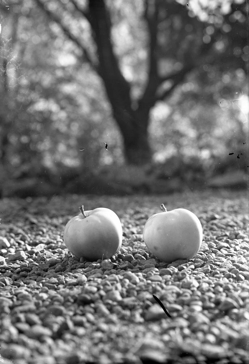 Närbild av två äpplen som ligger på grus, i bakgrunden finns träd och andra växter.