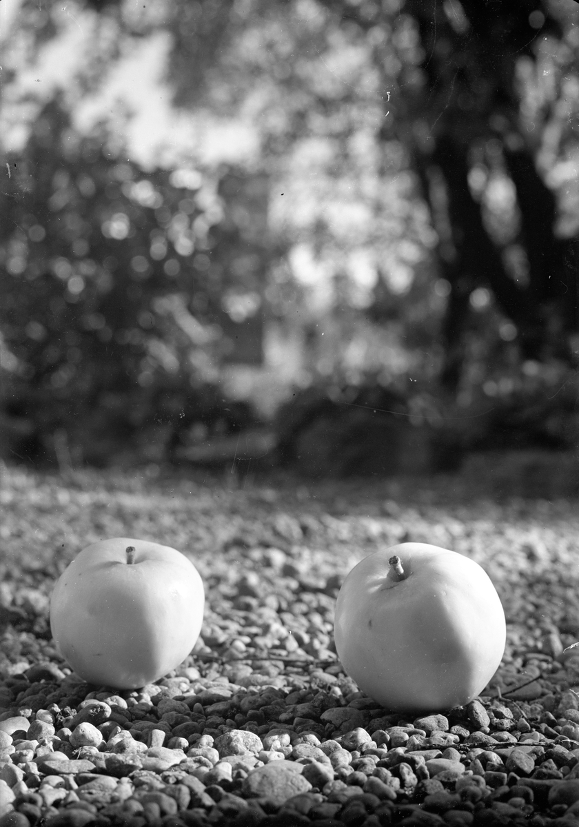 Titel: Närbild av två äpplen som ligger på grus, i bakgrunden finns träd och andra växter.