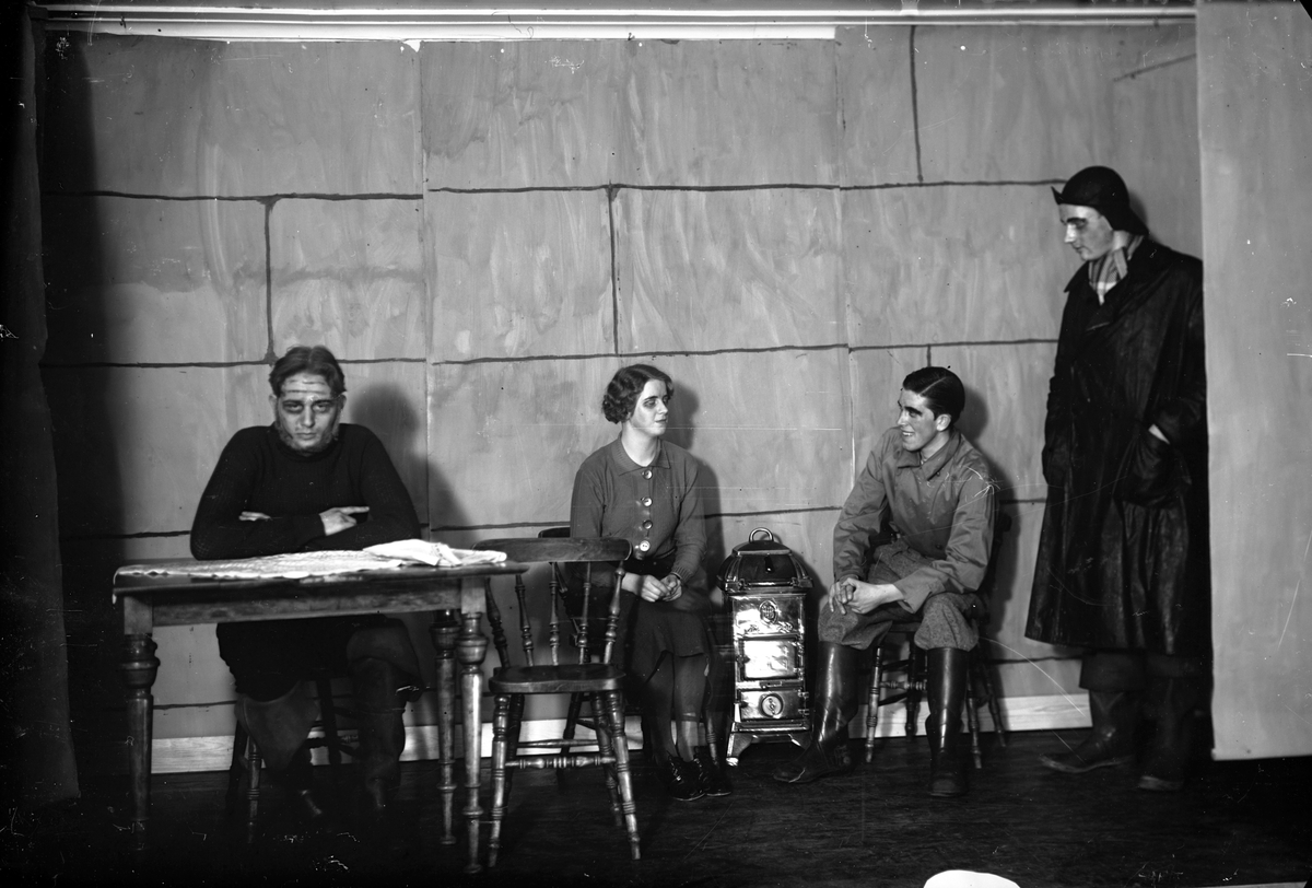 En man med skepparkrans sitter vid ett bord, en kvinna och en man sitter på var sin sida om en kamin och en man står vid sidan klädd i regnkläder. I bakgrunden finns en imiterad stenvägg.