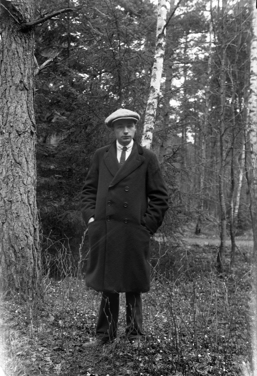Gustav Andersson står i skogen. En skogsväg skymtar mellan träden.