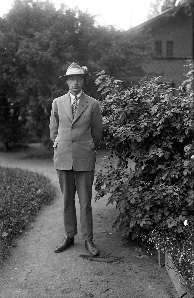 Gustav Andersson står på en gångväg vid en rosenbuske, i bakgrunden syns lövträd samt en tegelbyggnad. I kvarter Jägmästaren i Jönköping.