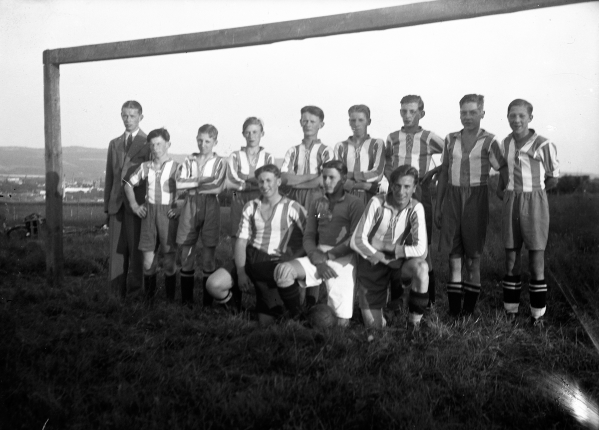 Elva fotbollsklädda pojkar och en man i kostym, är uppställda för fotografering i fotbollsmålet.