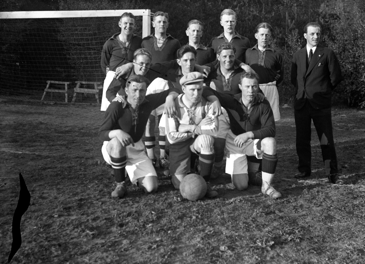 Elva män i fotbollsdräkter och en man i kostym står uppställda för fotografering vid ett fotbollsmål.